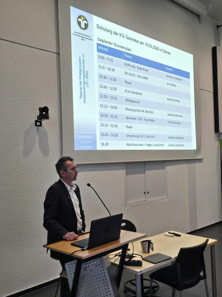 Ein weiterer fachlicher Schwerpunkt lag auf der Messung nach der 44. Bundes-Immissionsschutzverordnung (44. BImSchV), vorgestellt von Andreas Kohlmeier. Die Verordnung stellt neue Anforderungen an Messverfahren und Dokumentation bei bestimmten Anlagen und gewinnt damit zunehmend an Bedeutung für die Praxis im Schornsteinfegerhandwerk.