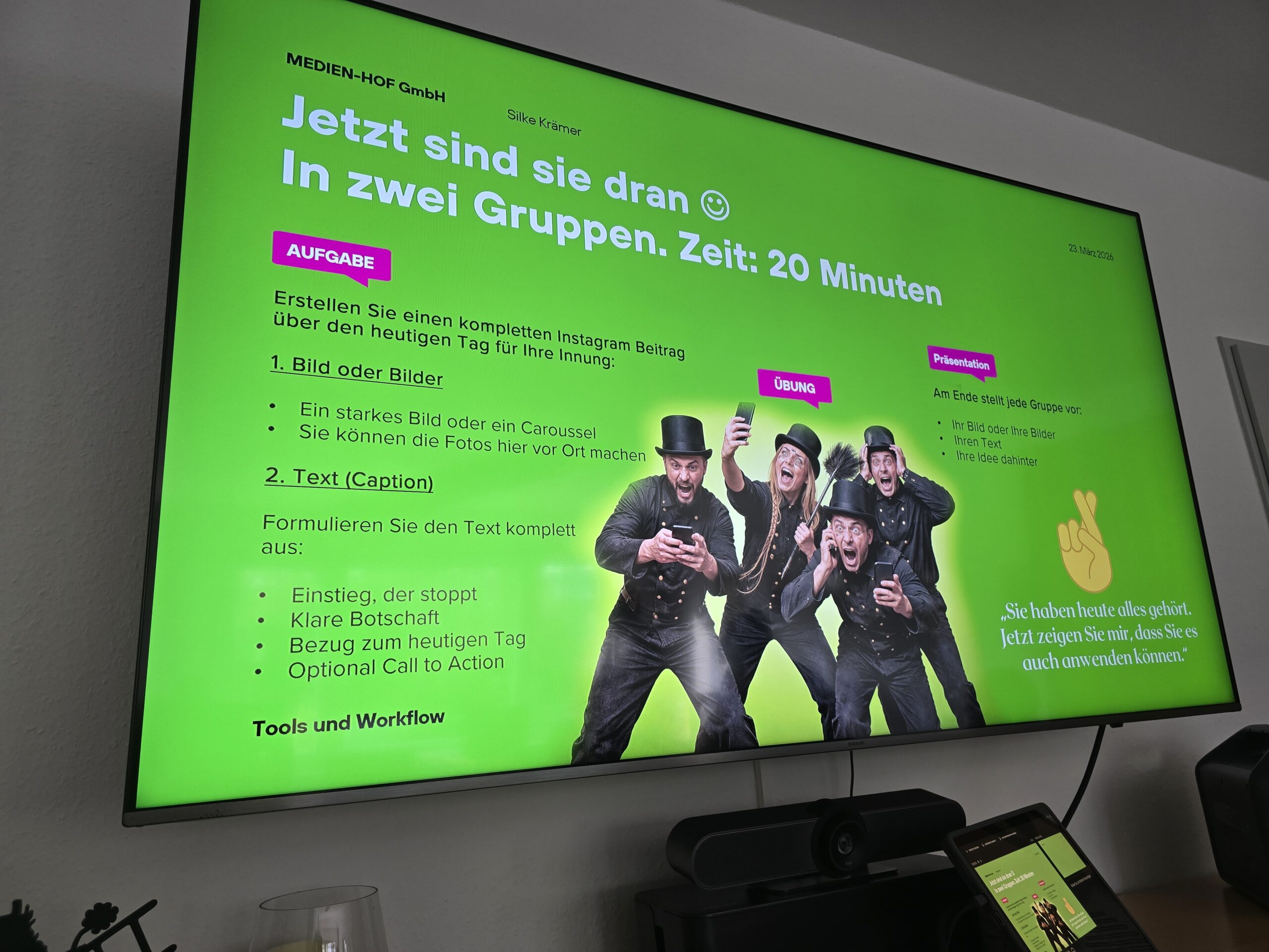 „Gerade der bewusste Umgang mit Bildmaterial und die Fähigkeit, komplexe Inhalte verständlich auf den Punkt zu bringen, machen heute den Unterschied in der Kommunikation aus“, so Silke Krämer (MEDIEN-HOF GmbH / Team Schwarz) während der Schulung.